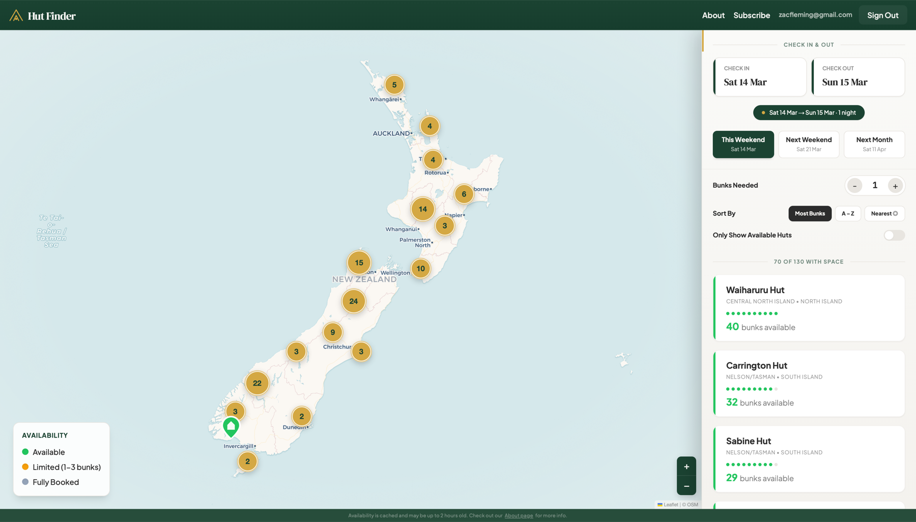 Real-time availability engine for NZ’s DOC huts. Live data harvesting.